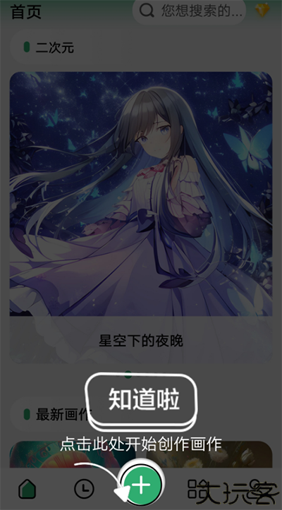 打开App主页,点击底部“+”图标,进入画作创作流程。