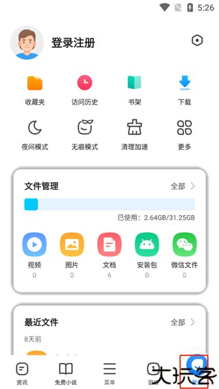 5、点击“我的”界面,里面有文件管理、夜间模式、无痕浏览、清理加速、访问历史、最近文件等等功能。