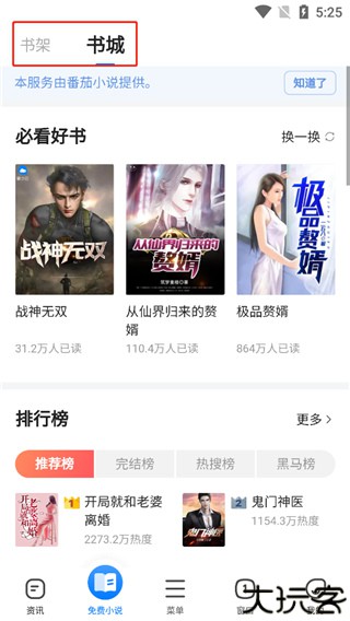 2、点击免费小说,里面为用户提供了一个免费的书城,用户如果想要看小说的话就可以直接在书城中搜索,当然,用户也可以将自己喜欢的小说添加到书架上,以便下次阅读;
