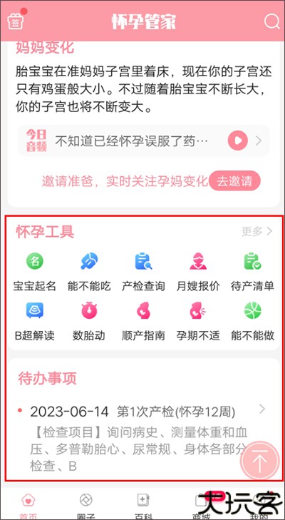 4、在app首页内,继续往下滑动,还有各种【怀孕工具】可以帮助用户在孕期的健康生活,以及产检提醒等。