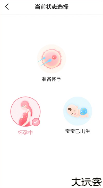 1、下载并打开怀孕管家app后,在进入主页面之前就可选择当前状态:分别是备孕,怀孕中和宝宝已出生。