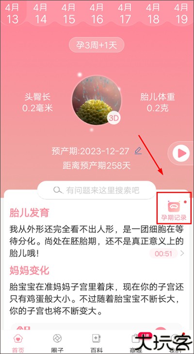 3、在app的首页里,用户可以进行【孕期记录】,以记录孕妇在孕期内所做的的各种事情,还有记录自身体重等。