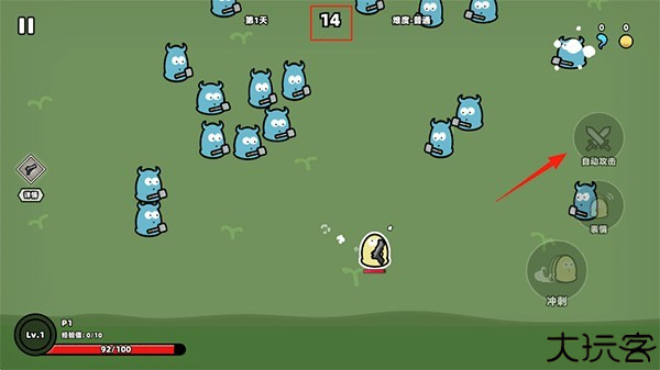 8、进入游戏操作页面,开启右侧的自动攻击模式,自动射击靠近的敌人,坚持到上方的时间倒计时结束即可胜利。