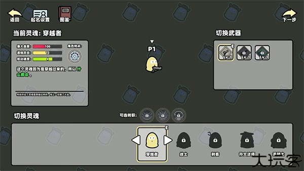3、进入游戏选择界面,左上角起名设置可以进入更改游戏昵称,右侧切换武器,下方切换灵魂(新手待解锁),点击图鉴。