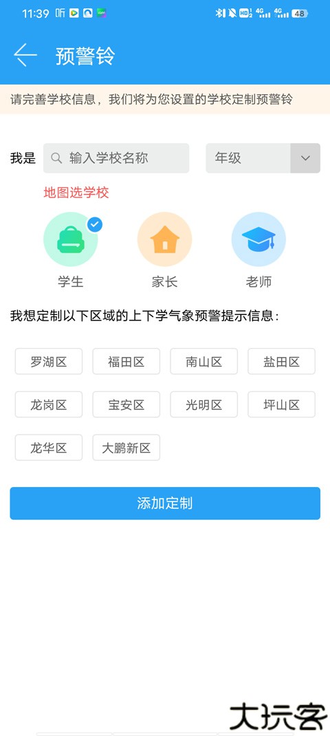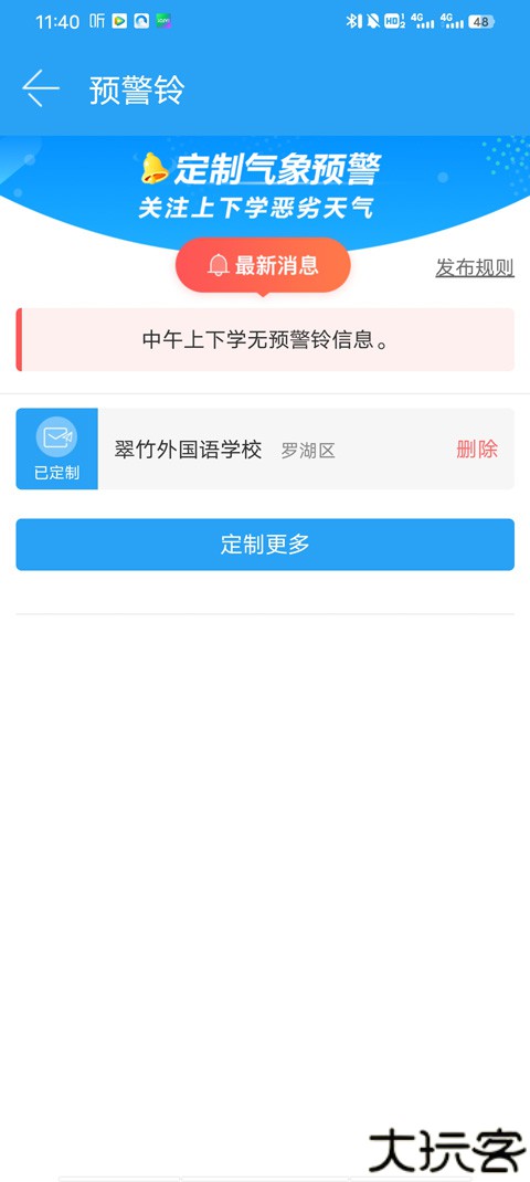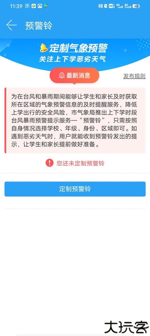 选择“定制预警铃”以接收台风暴雨等上学时段提醒。