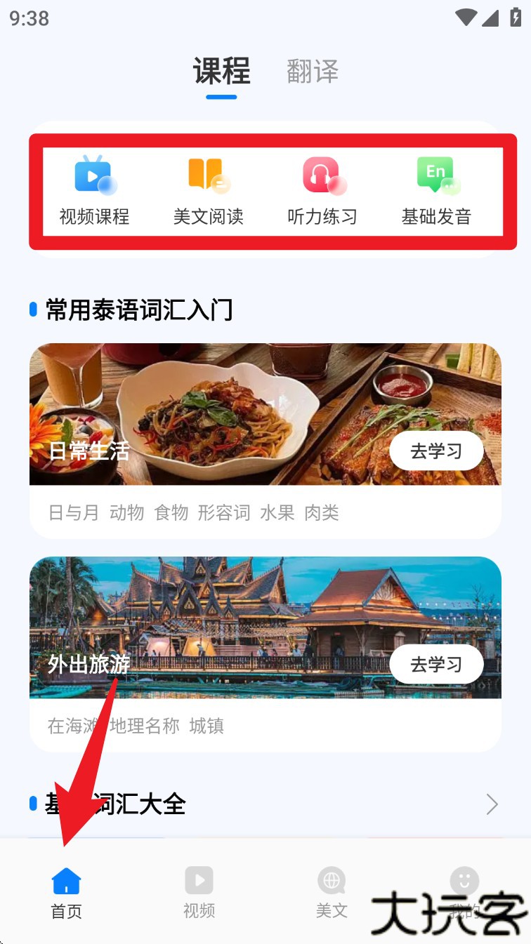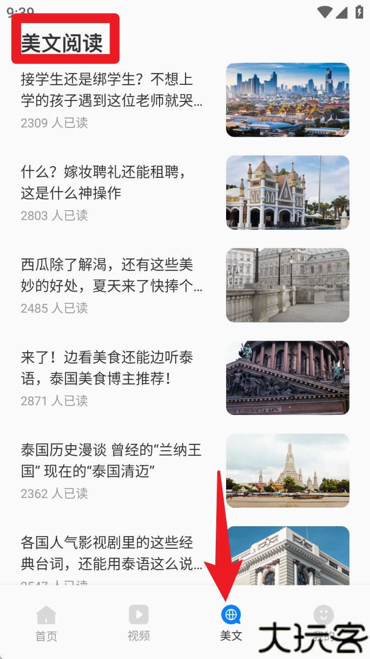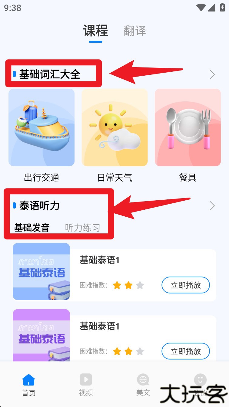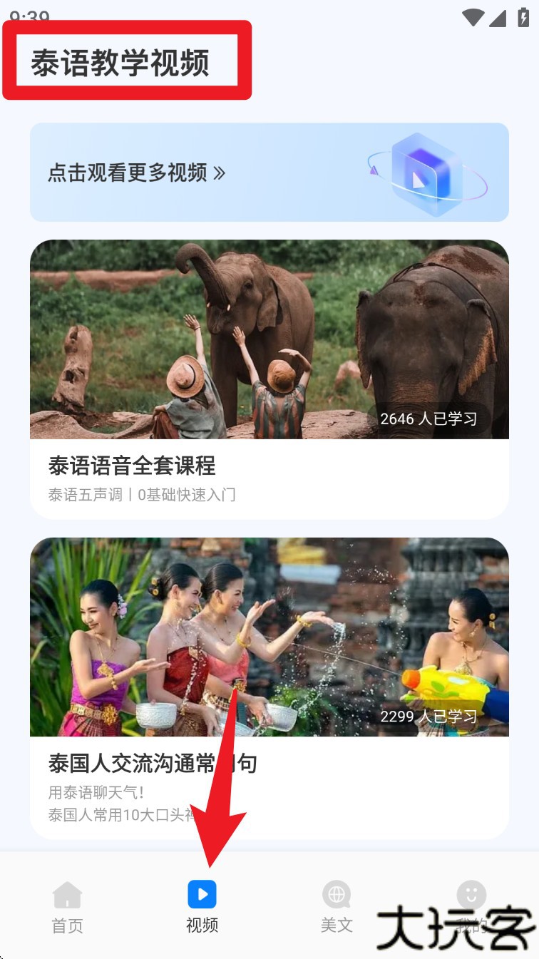 底栏提供教学视频和泰文阅读内容,支持音频、文章多种形式辅助理解。