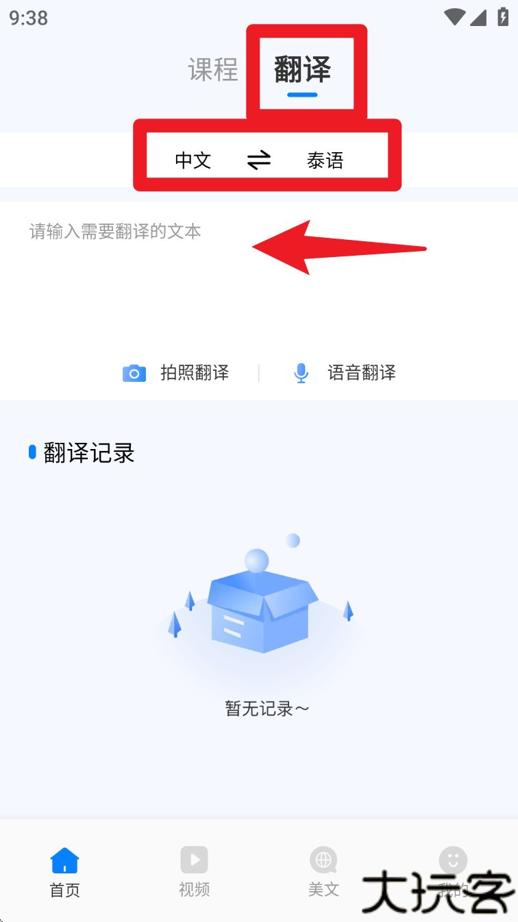 底部“翻译”栏提供拍照、文本和语音三种中泰互译工具,随时查词。