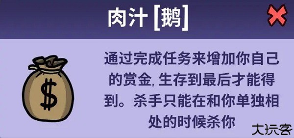 肉汁 - 完成任务会增加你在游戏结束时获得的赏金,如果你被鸭子杀死,他将获得赏金。