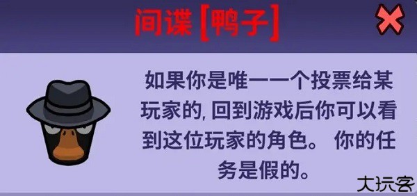 间谍 - 如果你是会议期间唯一一个投票给某个玩家的人,你可以得知他的身份。对付模仿鹅很有用:鸭子的数量是事先设置好的,但有模仿鹅时,鸭子阵营便会多出一只鸭子,此时间谍就可以用技能找出模仿鹅。