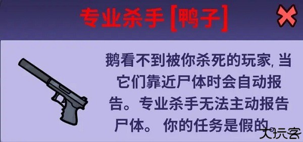 专业杀手 - 击杀后无法自我报告;其他鹅看不到你杀死的玩家的尸体,但其他鹅靠近尸体时会自动报告。