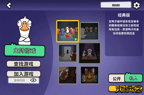 4、注册并登录成功后,点击开始游戏来创建房间。共有6种游戏模式,左边的主持游戏代表创建自己的房间,可以改为公开或者私人,私人房间只有好友和受到邀请的人可以加入,公开的话就以为这可以在查找游戏中搜索到你创建的房间。