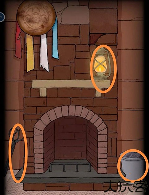 2、壁炉上方有提灯,左侧有火钳,右侧桶里是空罐头。
