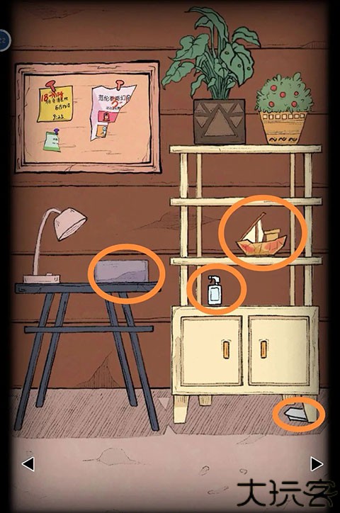 9、把旋钮放在台灯旁边的盒子上,同时收集木雕船和空的喷壶,过程记得查看柜子下压着的纸条。
