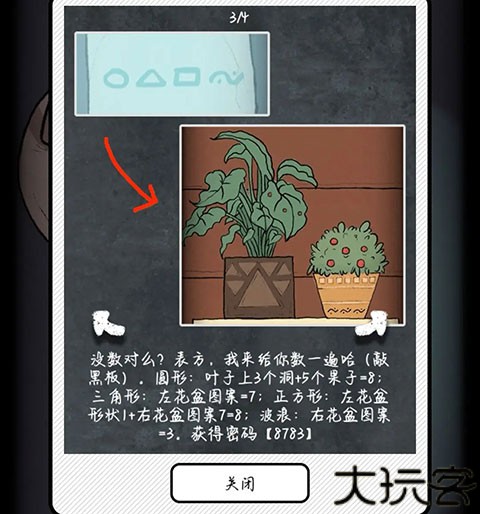 7、根据旁边的两个盆栽上的四个图案,玩家将会得到下方柜子左侧门的四个密码数字分别是8783。