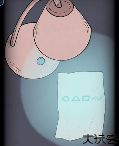 6、玩家将白纸放在台灯下,点击开关即可换成蓝灯,此时纸上会出现四个图案。
