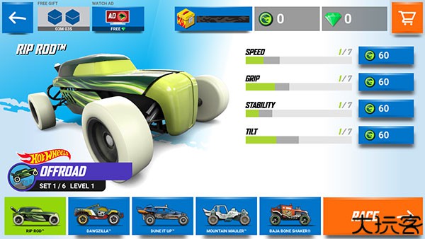 3、该界面显示了玩家将要驾驶的各种赛车,点击下方的赛车图片即可进行切换,也可以在右边进行升级,准备好之后,点击右下角的【RACE】按钮。