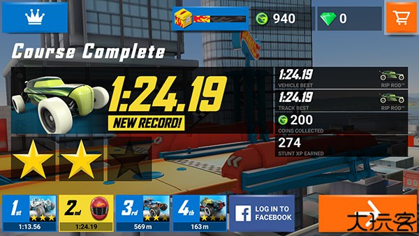 5、只要玩家保证不翻车,顺顺利利的到达终点即可通关,关卡的结算界面显示的就是玩家的总用时和获胜星数。