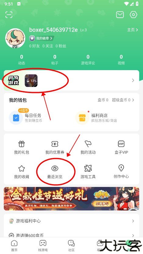在“我的”界面,点击我的游戏或最近浏览即可查看。