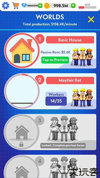 3、工人工作也会给增加经验值,经验值满了之后点击右上角按钮可以升级。