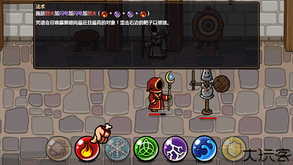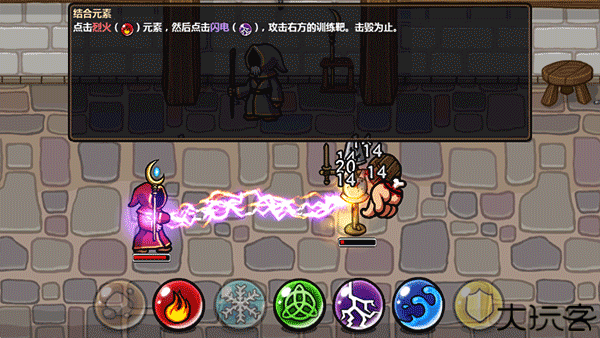 6、通过点击烈火元素按钮,再点击闪电元素,点击右侧训练靶,融合两者法术直到其被摧毁。