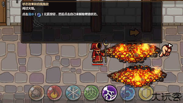 4、玩家穿越炙热的炭火后,可以使用流水咒语来扑灭身上的火焰。点击流水元素按钮,再点击自己解除燃烧状态。