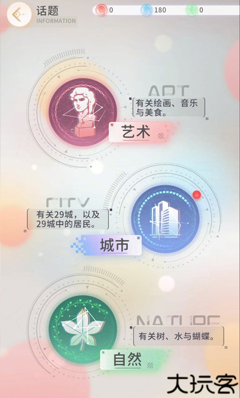 1、城市地点共有三类,“城市”、“自然”与“艺术”。在这三类地点中探索时,游戏角色会获得对应的三类“探索点数”,这些点数可以用于解锁话题。