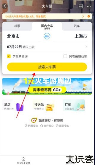 1、打开飞猪旅行手机版,在首首页“我的”选择登陆,在点击火车票这一选择进入。