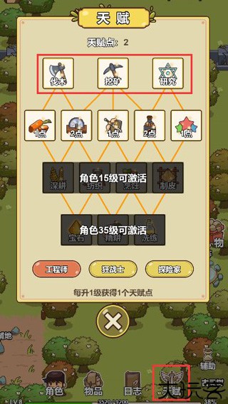 4、天赋加点推荐:伐木、跑动(增加移动速度)、整理、挖矿、研究、巧力。其他玩家根据需要自己加吧。