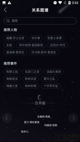 2、进入关系谱图查看事件脉络,并以星象形式展现人物历史。