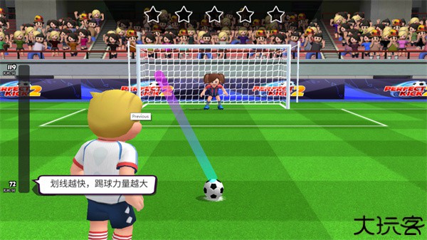 2、向球门滑动手指,球会被踢向划的方向,划线越快,球的速度就越快,左侧的速度表会体现出球速。
