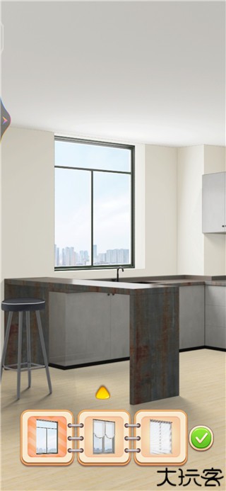 1、游戏开始,当选择一处地方需要装修时,使用一定的金钱后会出现三个不同风格的家居,根据自己的喜好来进行搭配。