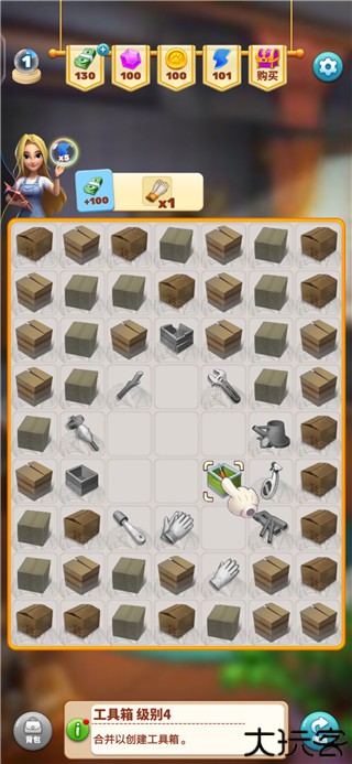 2、当金钱不足时,点击右下角进入消除小游戏。在这里拖动两个相同的工具将它们合并在一起,灰色的是无法直接拖动,只能被动合并,完成上方的工具任务时就可以获得金钱去进行装修。