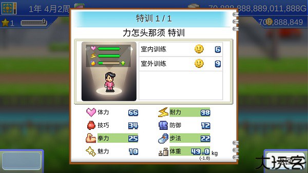 1、选手属性分为体力、耐力、技术、防御、力量、速度、魅力、体重。