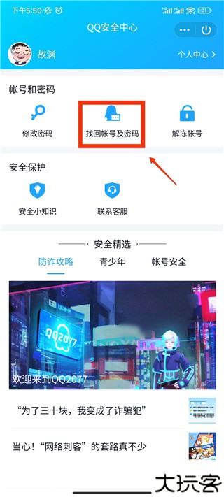 在安全中心内点击“找回账号/密码”,按指引继续下一步。
