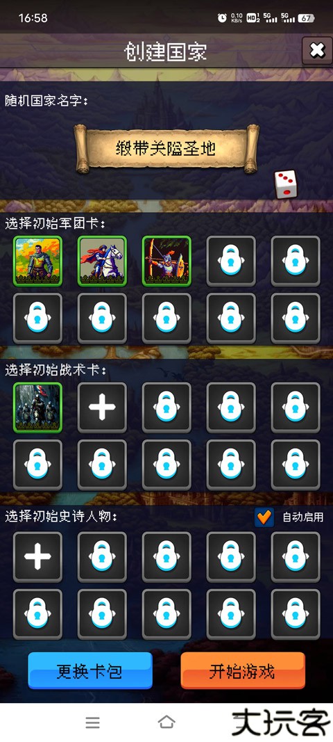 2、玩家需要创建国家,选择初始军团卡、战术卡,史诗任务等,完成后点击开始。