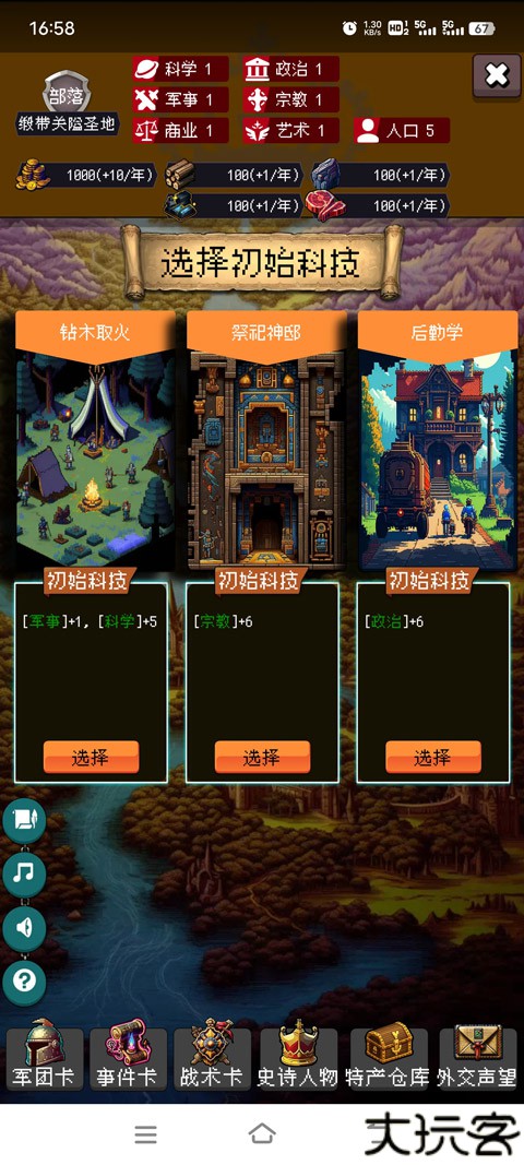 3、面对选择初始科技时,现有钻木取火、祭祀神邸、后勤学三种可以自由选择。