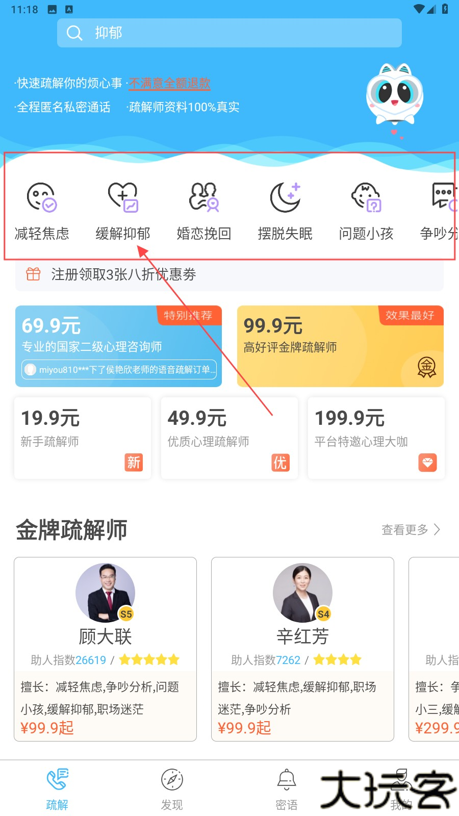 1、打开心灵密友心理咨询在去选择想要咨询的类型。
