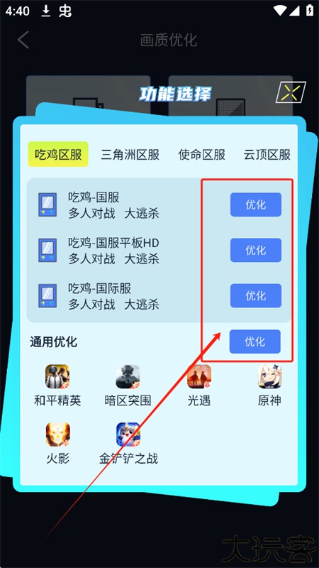 在游戏优化页选择目标游戏一键套用配置重启游戏体验画面提升并留意帧率波动。