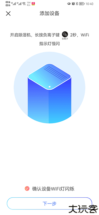 3、按照系统提示开启除湿机,确认设备的WiFi灯闪烁后,点击下一步。