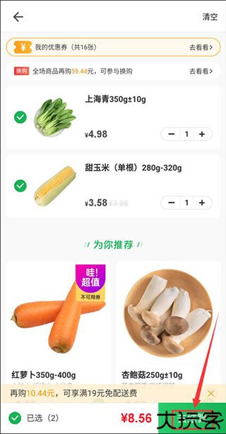 3、以上面同样的方法再添加其他的商品,全部添加完成后,点击下方中间的购物车图标即可开始结算。
