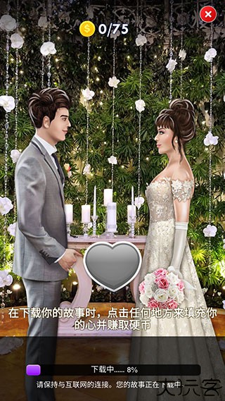 2、玩家在下载剧本故事时,可以点击游戏任何地方来填充爱心并赚取硬币,下载完成后点击屏幕即可开始游戏。