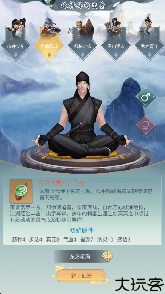 1、开局前,可以选择自己的性别,不同的出生会有不同的属性。