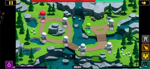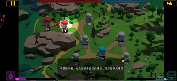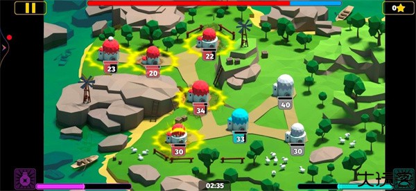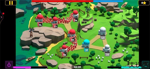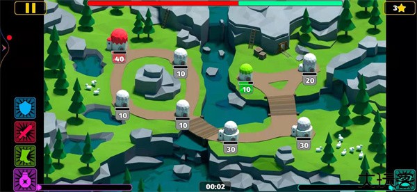 游戏开始时,将拥有一座或多座屯有兵力的堡垒,目标是占领那些未被开拓的堡垒,一步步囤积士兵,运用谋略与智慧消灭其他敌方士兵,赢得战局胜利。首先,点击拥有兵力的堡垒(我方堡垒标识为红色),然后点击未被占领的(未被战令堡垒标识为白色),就能指挥士兵进行攻陷,争夺成功后,该堡垒变为红色。当兵力积累到合适数量时,即可进行下一步的讨伐攻占。当敌方兵力以及城堡全部被我方攻陷时,战斗宣告胜利。