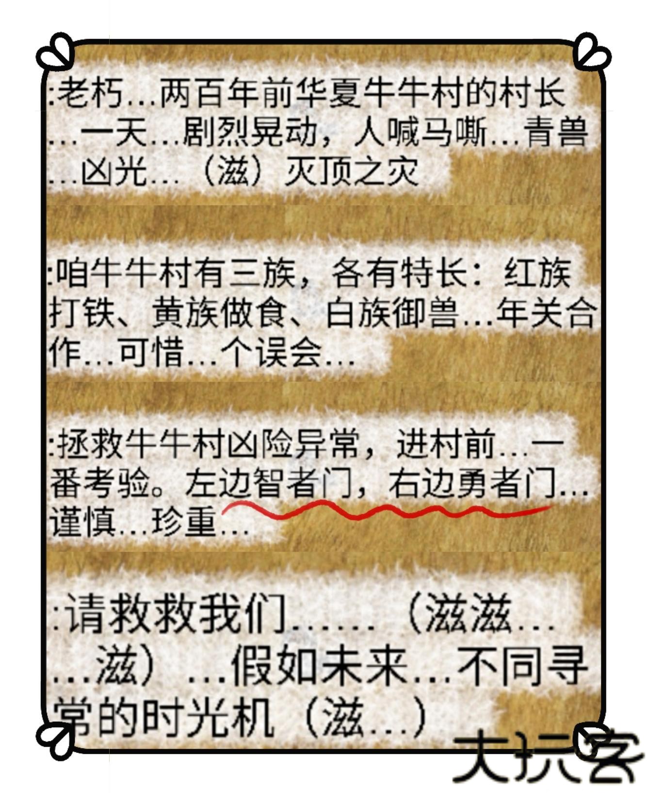 2、点击公告栏,我们收到了来自两百年前的信息。牛牛村遇到袭击了?时光机在哪里?