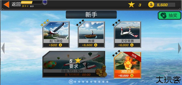 2、挑选起飞教学、空中竞速、消防等任务开始挑战。