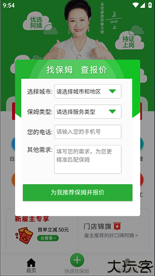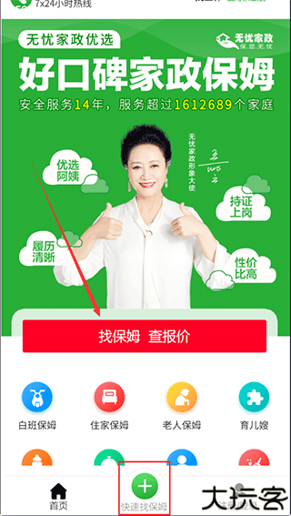 1、打开后,点击“找保姆查报价”或者“快速找保姆”。