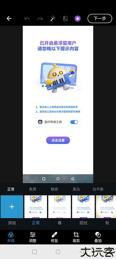 3、有着一系列的功能来去使用调整、修复、剪切、叠加、文本、贴纸、边框等操作。