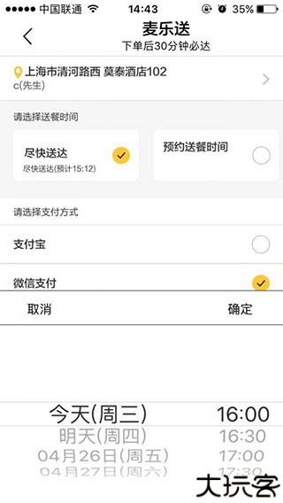 8、在此页面中我们可以点击选择送餐时间,有需要预约送餐时间的用户可以点击预约送餐时间,此时会在屏幕下方弹出一个时间列表,可以通过滑动来选择预约的时间,选择完成后点击右上角的确定即可,而在下方则可以选择我们的付款方式,目前暂时只允许支付宝与微信的在线支付方式,选择完成确认信息无误后点击右下角的下单跳转到付费页面中进行付款即可点餐成功,麦当劳承诺30分钟内送到,只需等待就好了。