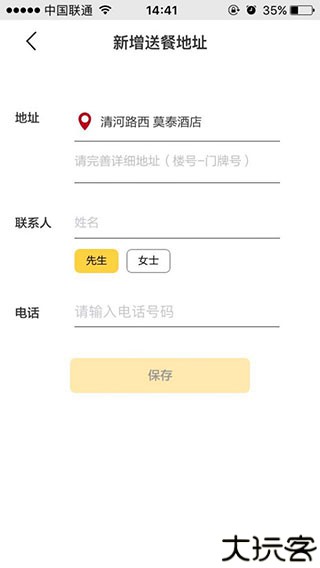 5、然后就可以在麦当劳app中为用户的地址添加上门牌号或者是楼号房号等等,再在下方完成基本的资料,姓名性别手机号等等,特别注意的是手机号必须正确,要不然是有可能让送餐人员联系不上用户的,而编辑完成后点击下方的即可保存添加地址,保存后点击该地址则可以用该地址来进行点餐服务了。