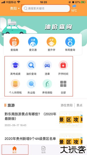 2、首页提供高考成绩、油价、违章、社保及个税等查询。